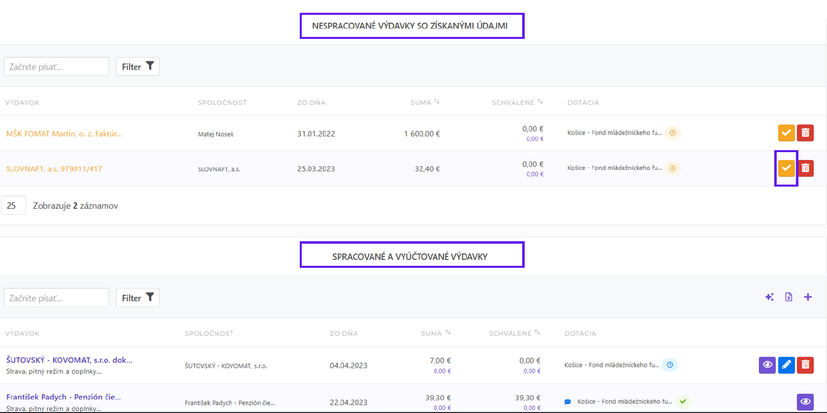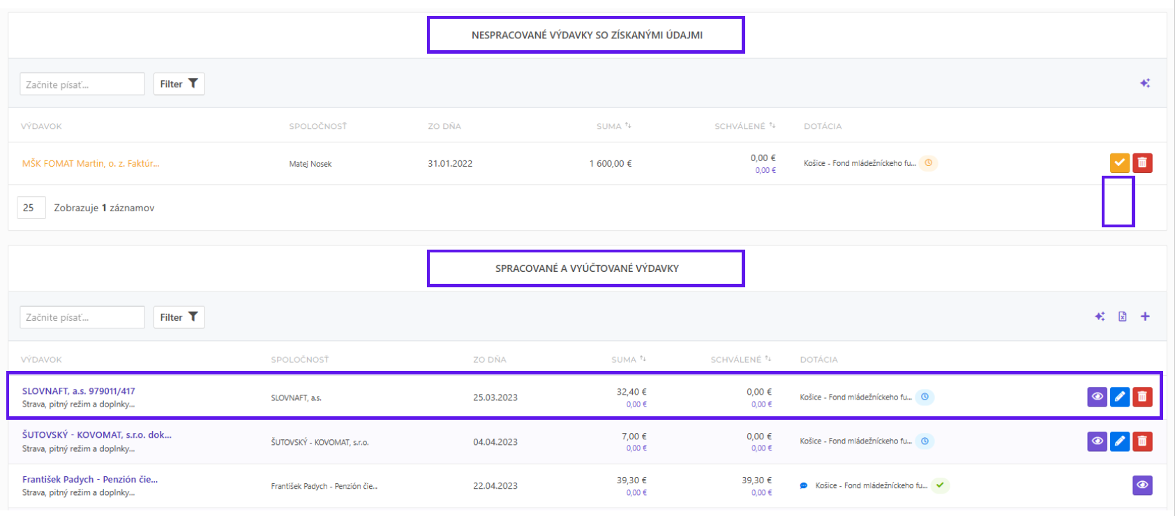 Uložením výdavku podľa vyššie uvedeného postupu ste tento výdavok vyúčtovali pre vybranú dotáciu a ako môžete vidieť nižšie, výdavok sa presunul z nespracovaných výdavkov do sekcie spracovaných a vyúčtovaných výdavkov. Vy môžete tento postup aplikovať znova pri ďalšom nespracovanom výdavku a úspešne tak nahrať vaše vyúčtovanie do dotačného systému.