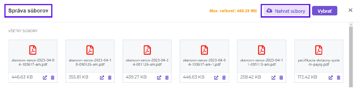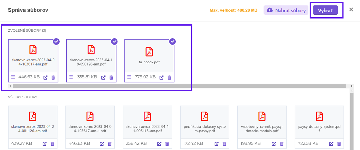 Účtovné doklady nahrávate v správe súborov. Pomocou tlačidla Nahrať súbory si z vášho počítača vyberiete kópie účtovných dokladov (sken, fotografia) a následne môžete tieto doklady dať vybrať ako vidíte na nasledujúcich obrázkoch.