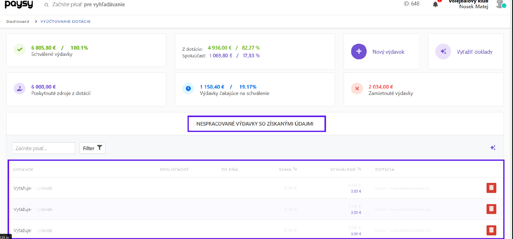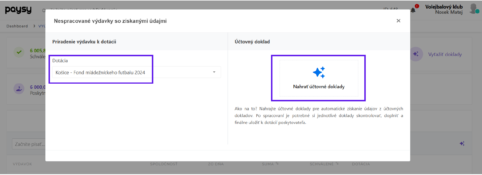 Máte možnosť nahrať Nový výdavok manuálne ako doteraz, alebo automaticky nahrať výdavok/ky pomocou Vyťažiť doklady, čo Vám prinesie rýchlejšie a efektívnejšie vyúčtovanie vašej dotácie ako uvidíte nižšie v tejto ukážke.