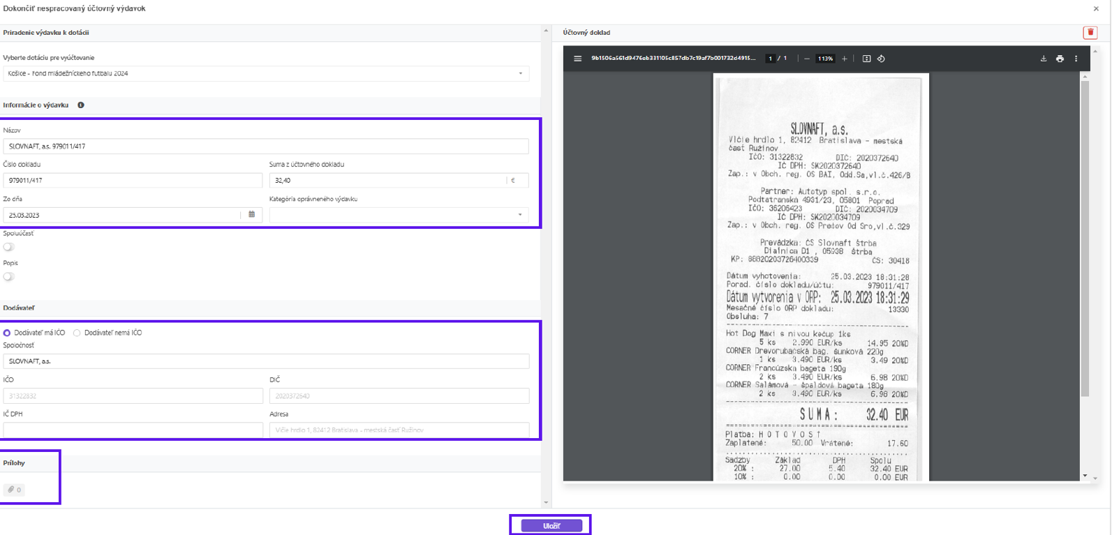 Údaje, ktoré vidíte v Informáciách o výdavku a dodávateľovi vyplnené, za vás automaticky vyplnil = vyťažil systém, čím vám uľahčil prácu s účtovnými dokladmi a prepisovaným. Vašou úlohou je skontrolovať si správnosť týchto informácií, vybrať kategóriu oprávneného výdavku, priložiť povinné prílohy, ktoré sú potrebné (potvrdenie o úhrade, zmluva atď.) a vyžaduje ich mesto a na záver dáte Uložiť, čím potvrdzujete správnosť vyplnených informácií.