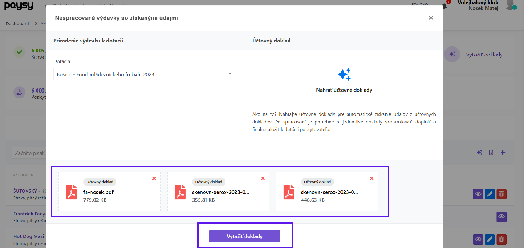 Po kliknutí na Vyťažiť doklady sa zobrazí okno, v ktorom priradíte výdavok ku dotácii a následne nahráte jeden, alebo viac účtovných dokladov.